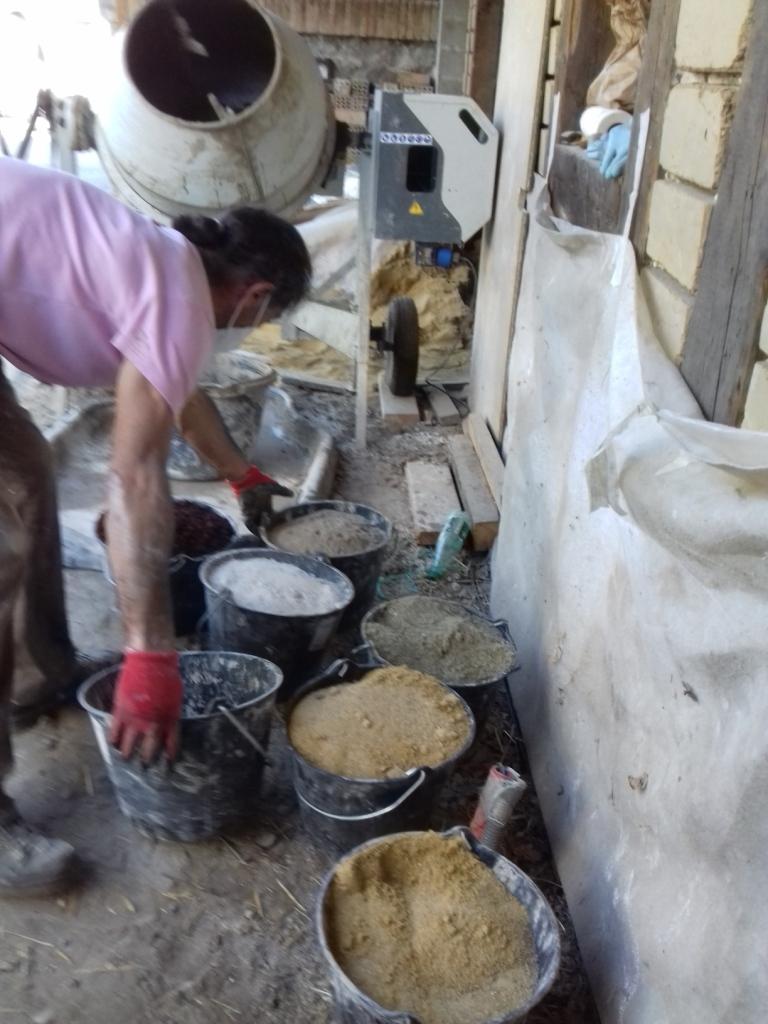 Y a plus qu'à!!! en avant pour 15 jours de location de la bétonnière, plus de 6 voyages pour ramener du sable , de la pouzolanne, les sacs de ciment naturel et de chaux vu que le camion de location a une charge qui ne doit pas dépasser 800 kg ou 1T...et que l'espace utilisable sous le bâtiment est réduit.